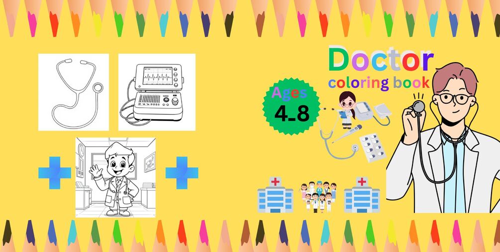 A fun coloring book that introduces children to the world of medicine through simple drawings of doctors, nurses, an ambulance, a stethoscope, a syringe, a thermometer, medications, and a hospital.